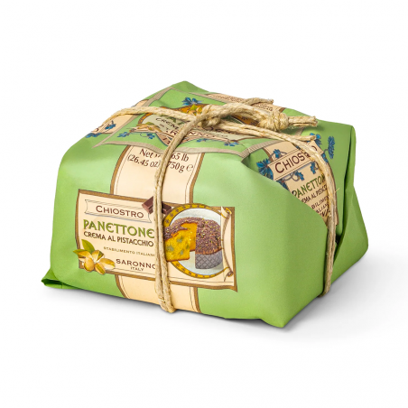 Tradiční Italské vánoční pečivo Panettone plněné pistáciovým krémem s čokoládovou polevou a sekanými pistáciovými ořechy, balené v elegantním ručním rustikálním papíře. Panettone Chiostro di Saronno je vyráběno podle tradičního receptury založeného na pomalém přírodním kvašení a všechny ingredience, od mouky po mléko, od vajec až po máslo, droždí, jsou přírodního původu, čerstvé a pravé, bez konzervačních látek a barviva.