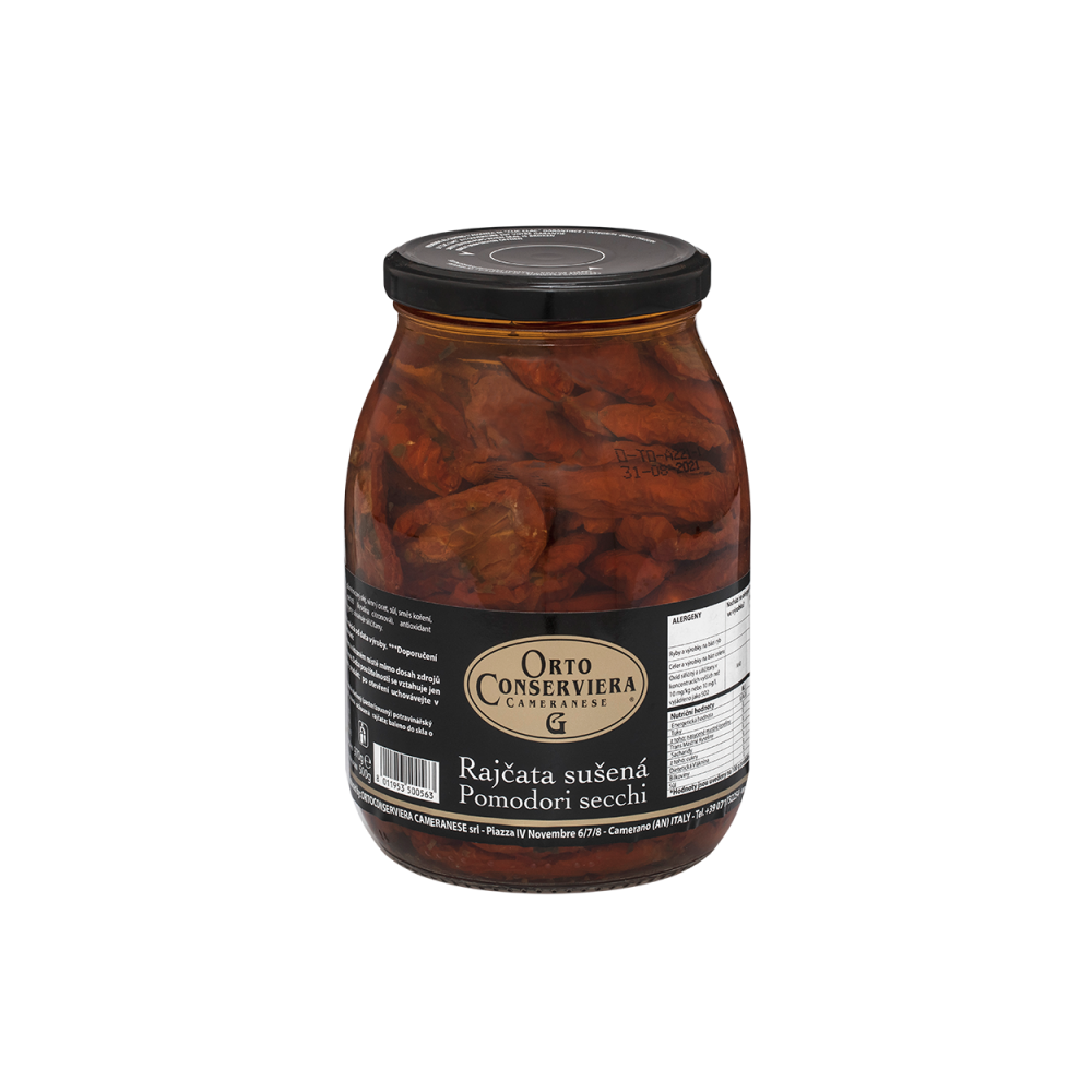 Sušená rajčata 52%, slunečnicový olej 47,6%, sůl, ocet, aromatické bylinky, koření, aroma. Korektor kyselosti: E330. Antioxidanty: E300.