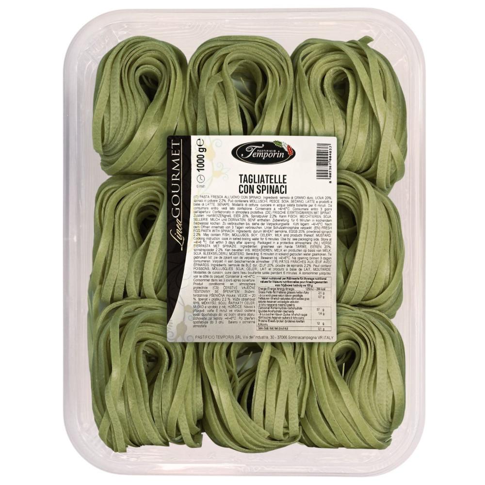 Chlazené špenátové těstoviny jsou vyrobeny ze semolínové mouky s přídavkem vajec té nejvyšší jakosti ,,LINEA GOURMET". Tagliatelle jsou tradiční těstoviny z regionu Emila Romagna. Ideální pro hustší omáčky, často kombinované s hovězím a telecím masem, občas i s králíkem. Nejslavnějším receptem je pravděpodobně ragů Bolognese, nejrozšířenějším pal s tomatovou omáčkou a čerstvou bazalkou.