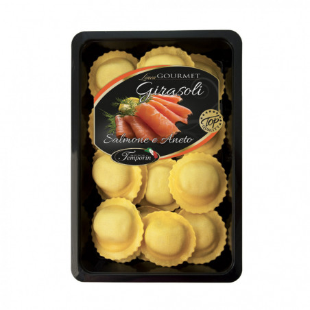 Plněné čerstvé těstoviny ve tvaru slunce zauzeným lososem a koprem.