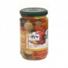 Zelenina v různém poměru (mrkev, papriky, cibule, okurky, celer houby, zelené olivy, černé olivy, artyčoky, houby „Agaricus bisporus“, zelí, fenykl. Obsahuje oxid siřičitý) 57,1%, olej ze semen slunečnice, vinný ocet, sůl. Regulátor kyselosti: kyselina citrónová. Antioxidant: kyselina askorbová, příchutě. Po otevření uchovávejte v ledničce.